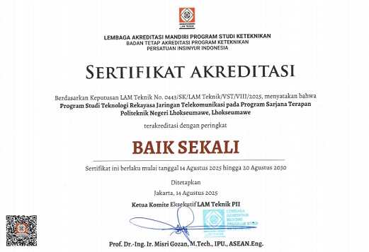 Program Studi (Prodi) Teknologi Rekayasa Jaringan Telekomunikasi (TRJT) adalah satu dari 7 Prodi yang ada di Jurusan Teknik Elektro (JTE) Politeknik Negeri Lhokseumawe (PNL). Prodi TRJT, pertama kali berdiri pada tahun 2016, menggunakan nama Teknik Jaringan Telekomunikasi (TJT). Nama Prodi TJT ditentukan berdasarkan Nomenklatur Program Studi, yang mengacu pada Peraturan Menteri Pendidikan dan Kebudayaan (Permendikbud) No. 154 Tahun 2014 Tgl. 14 Oktober 2014, tenta...
